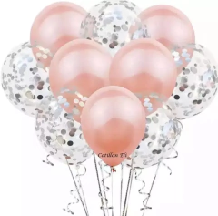 Set Globos Latex Rosa Gold Transparente Confetti Plateado